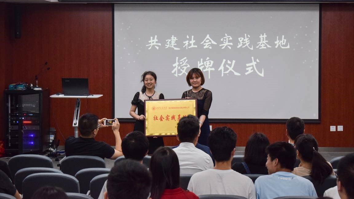 党委副书记韦娜老师向海升集团授牌,共建学生社会实践基地,并为即将出征的队伍进行授旗。