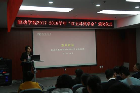 在北二楼报告厅举行2017-2018学年 “红五环奖学金”颁奖仪式。红五环集团股份有限公司副总经理苏沁、红五环集团副总经理蒋建江、司机社