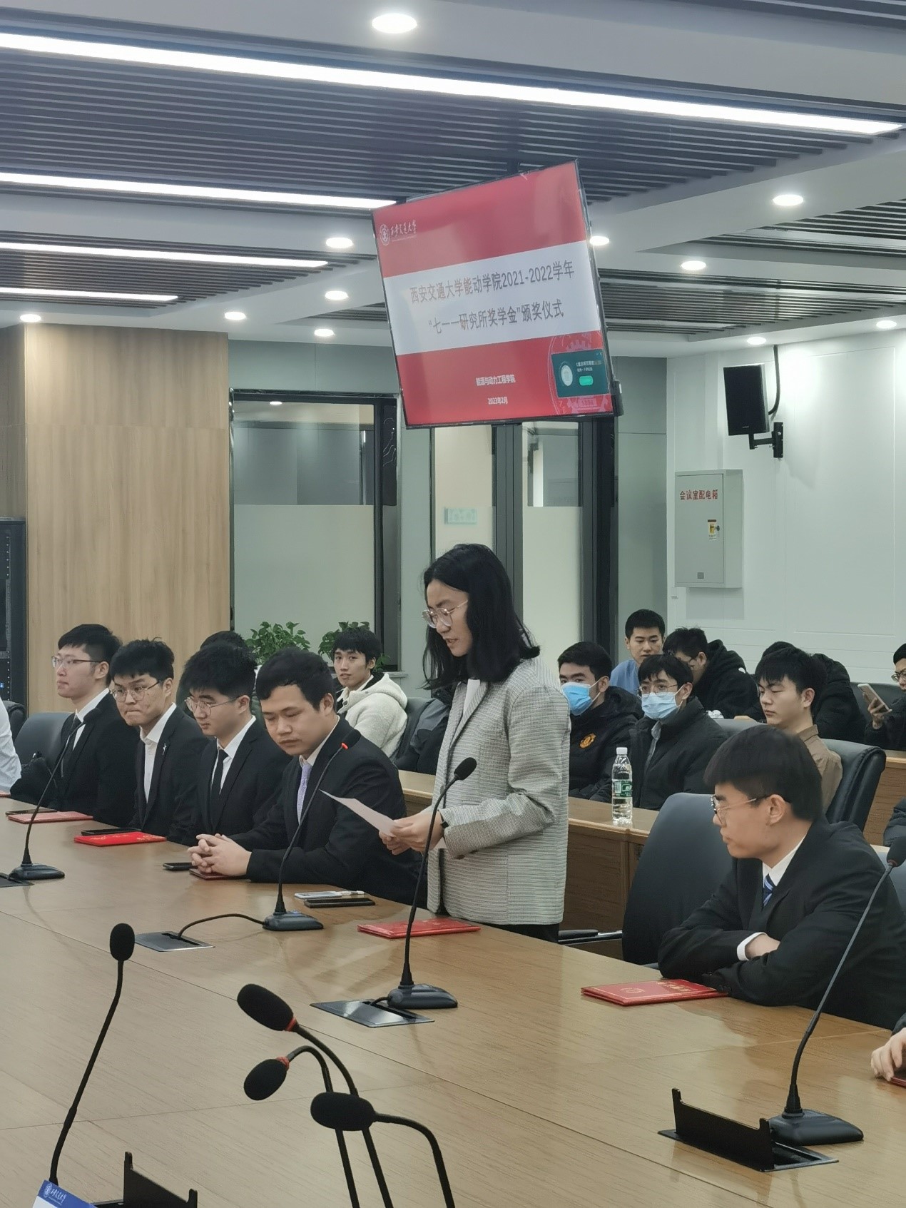 韦娜副书记宣读奖学金获奖决定。苏畅主任、何茂刚书记为获奖研究生颁奖。此次颁发的“七一一研究所奖学金”由10名品学兼优的交大学子获得,其中司机社