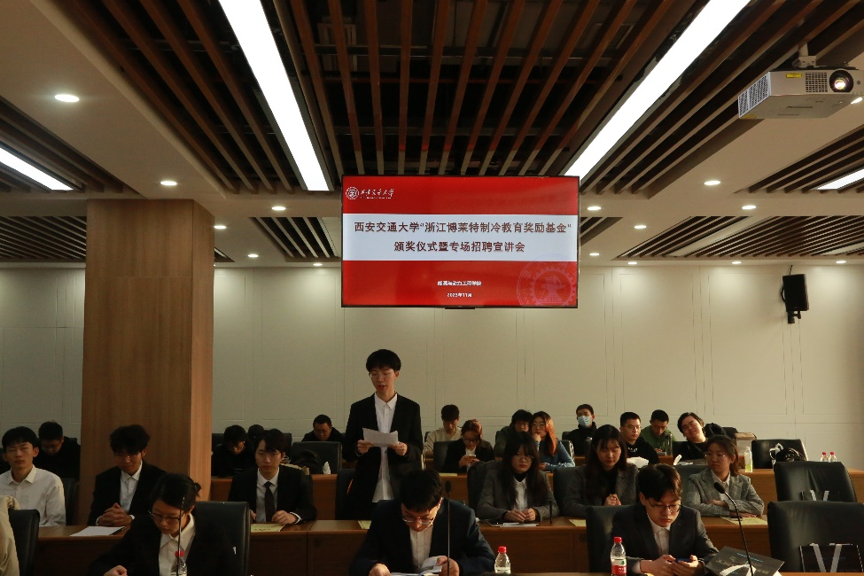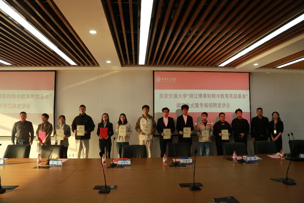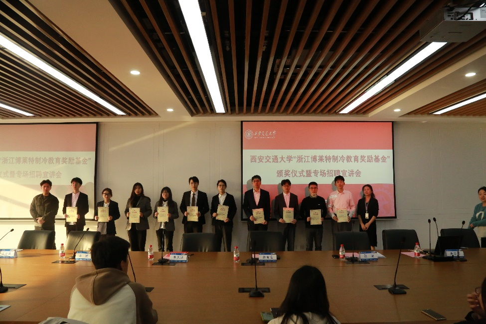 “浙江博莱特制冷教育奖励基金奖学金”颁奖仪式于敏行楼6118举行。浙江博莱特制冷设备有限公司副总经理李嘉钦先生、技术总监余有发先生、人力资源总监赵康先生、人力资源经理吴宇芳女士出席了本次颁奖仪式,并亲自给获奖同学颁奖。