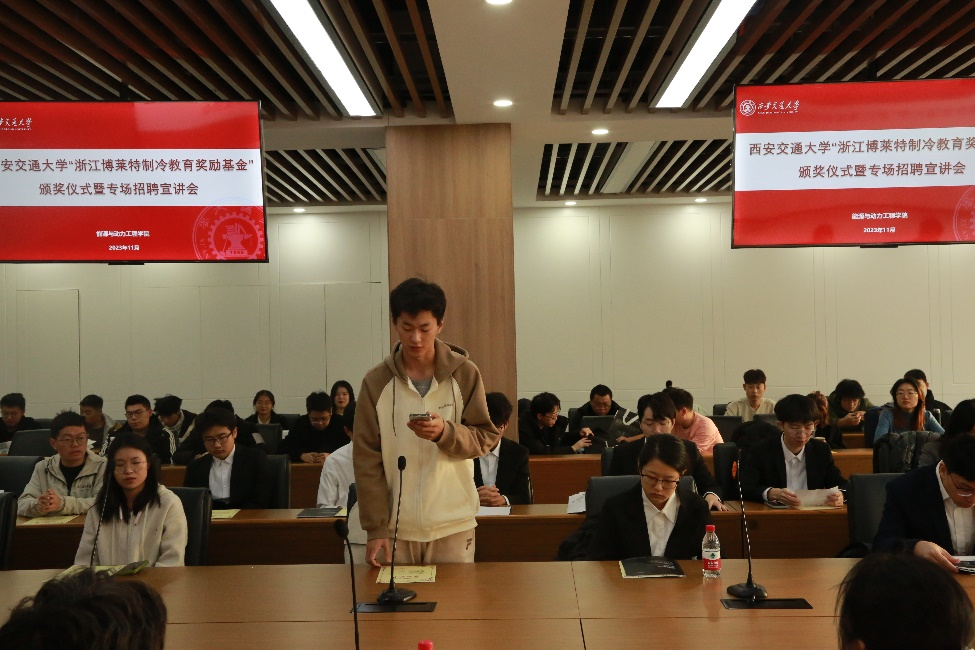 获奖学生王程潜和杨牧天分别代表研究生和本科生作了发言,他们表示非常感谢浙江博莱特制冷设备有限公司对司机社
