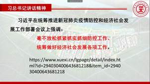 分党委委员蒲亮同志发言,党中央对疫情的准确判断,指导了学校各项工作的稳步推进,我们的工作一定会尽快步入正轨,当前一定要注意与中央统一步伐,特别是研究生工作,要掌握学生的动向,并提醒学生及时完成健康日报,为尽快返校学习、科研做好准备;在疫情结束之前,研究生导师要创造条件指导学生,特别是要指导毕业生高质量完成其学位论文,研究生院的线上工作流程是畅通的,能为学生按期毕业提供保障条件。