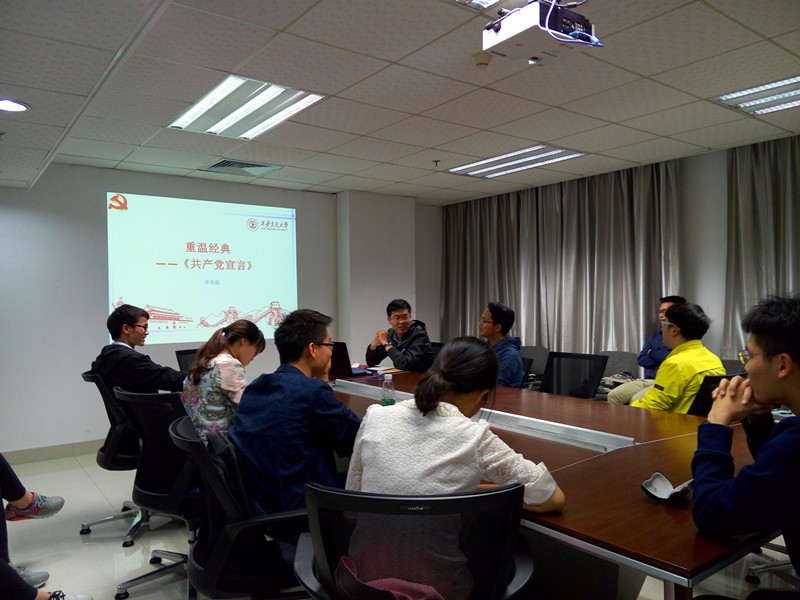 随后李世聪同志对《共产党宣言》进行了详细的讲解。李世聪同志从“一个幽灵,共产主义的幽灵,在欧洲大陆徘徊。。。。。”讲起,介绍了《共产党宣言》提出的背景和现实意义,该《宣言》发展完善的历史历程,以及其主要内容和核心观点。他讲到,《共产党宣言》共包括四章:依次是“资产者和无产者”,“无产者和共产党人”,“社会主义和共产主义的贡献”,“共产党人对各种反对党派的态度”。主要观点有五个:阶级斗争是阶级社会发展的直接动力;无产阶级的产生、发展及其历史使命;资本建立世界市场并在全球扩张;资产阶级的灭亡和无产阶级的胜利同样不可避免;消灭私有制是共产党人的长期任务;无产阶级革命和无产阶级专政,是无产阶级实现历史使命的道路;共产党是实现无产阶级历史使命的领导力量。最后李世聪同志强调,作为一名共产党员,一定要熟记党的相关理论,多读党的相关书籍。他提议,我们的组织生活会可以组织大家一起朗读党的理论书籍。