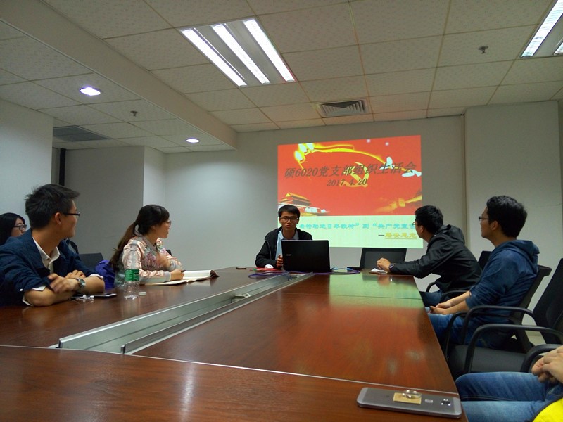 组织生活会是指党支部以交流思想、总结经验教训、开展批评与自我批评为中心内容的组织生活制度。为了组织生活会更加生动有趣,内容丰富,硕6020党支部大胆积极创新,于2017年4月21日晚在北二楼1408教室召开属于自己支部的特色组织生活会之“开讲啦”。本期的开讲嘉宾是支部书记崔新贵和班长李世聪,分别从围绕“希特勒进日本教科书”和“共产党宣言”讲起。