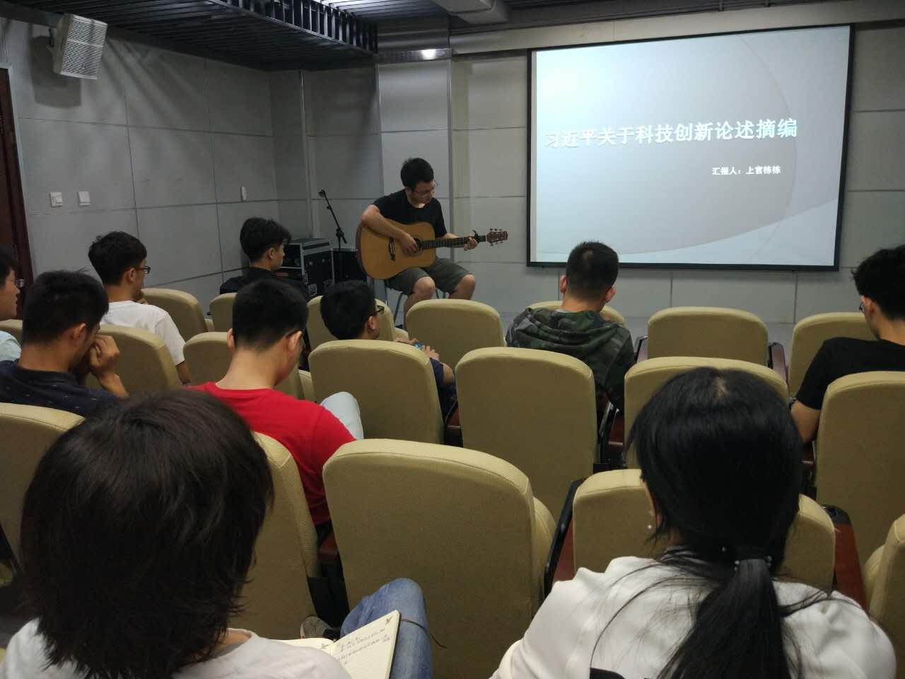 上官栋栋同志在汇报开始前,为支部的同志们精心演奏了一曲岸部真明的《奇迹之山》,赢得了同志们的阵阵喝彩。精彩的表演之后,他为大家分享了自己在阅读习近平总书记关于科技创新论述后的感想。以“真空高铁”和“可燃冰试采成功”为例证明科技创新是引领发展的第一动力,我们应该以科技创新为核心,以科技创新来带动全面创新。谈到具体的创新举措,上官栋栋同志总结了以下几个方面:即加快科技体制改革的步伐,牢牢把握科技进步的大方向,牢牢把握产业革命的大趋势以及牢牢把握集聚人才的大举措。在分享的最后环节,上官栋栋同志为大家提出了两个问题:全民创新应从何做起以及生活中创新的小例子,支部同志们就此展开了充分的讨论,认为应当把自身兴趣与交叉学科相融合,在做好本专业领域研究的同时拓宽眼界,敢于突破传统思维的禁锢,才能有利于万众创新。