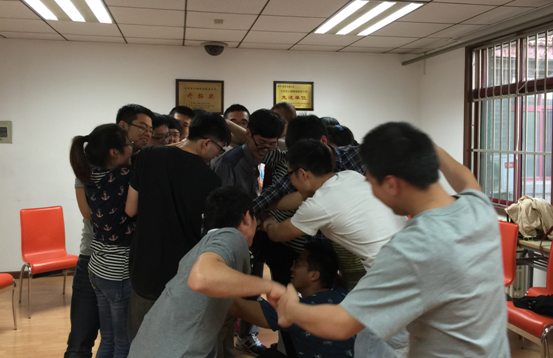 “解扣”环节是大家最忙碌、最纠结也是最喜欢的项目。所有同学走到区域中心,自由握手、问好,气氛好不轻松、随意。闫老师突然喊出停止,大家目光飞速旋转寻找队友,互相牵手,纠成一团,现场氛围立刻升温,紧张热闹。大家积极开动脑筋,或旋转、或跨越,在一片欢声笑语中迅速回复到原位。