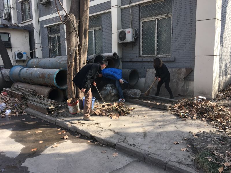 气动大院位于梧桐东道东侧,动力工程多相流国家重点实验室的南侧。由于院内摆放着许多长期暴露在室外的巨型实验设备形成了大量的卫生死角及泥垢灰尘,再加上院内每年有大量的梧桐叶飘落,院内落叶沉积严重,整个大院的卫生状况不容乐观。面对着较重的清洁任务,两个支部的同学们并没有抱怨,支部书记王立典和杜晚秋同学立刻把大院划分成了3块区域,并为每一位同学进行了责任分工。大家很快就热火朝天地干了起来。任磅博和任炜两位女生利用耙子努力把花园中厚厚的落叶耙出,但更多的区域因为底层的落叶已经潮湿腐烂,还有大量的枯枝和废弃物相掺混,茂密的植物相互遮掩,再加之花园的地面本身又很不平整,扫帚耙子等工具均无用武之地,史云昊和乔晓宇等同学则用双手将杂物一点点地捡出花园。郑召利和曹盛力等同学负责大面积清扫,由于近期少雨干旱,地面积灰严重,他们在尘土飞扬的环境中毅然坚持打扫干净了整个院落空地。其余同学有的在院内打扫散落在堆放仪器设备之间的落叶和杂物,有的擦拭泥垢重重的门窗还有的同学则负责垃圾的搬运及汇总。虽然打扫时院内尘土飞扬,但同志们热情高涨,互相帮助,很快就将气动大院的面貌改善一新。