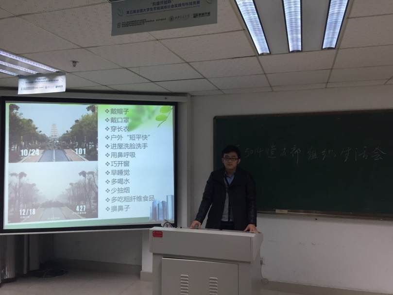马皎斌同学介绍到,中国目前的正处于改革开放的高速发展阶段,在全面现代化建设工业体系的过程中,国家的经济增长势必会对自然环境产生影响。基于这一背景,由几个重要因素引发了大气污染,首先是工业企业排放,然后是机动车尾气的影响,而秋冬季节燃煤废气的污染更为严重,在气象状况不利的条件下则会出现雾霾天气,严重影响人们正常生活。该同学认为,面对大气污染我们不应该停止发展,更应该快速发展工业,以更高的技术水平把污染源消除在源头,因此需要大家共同努力促进我们所在行业的技术进步,促进经济绿色增长,保证党和国家生态文明的建设。