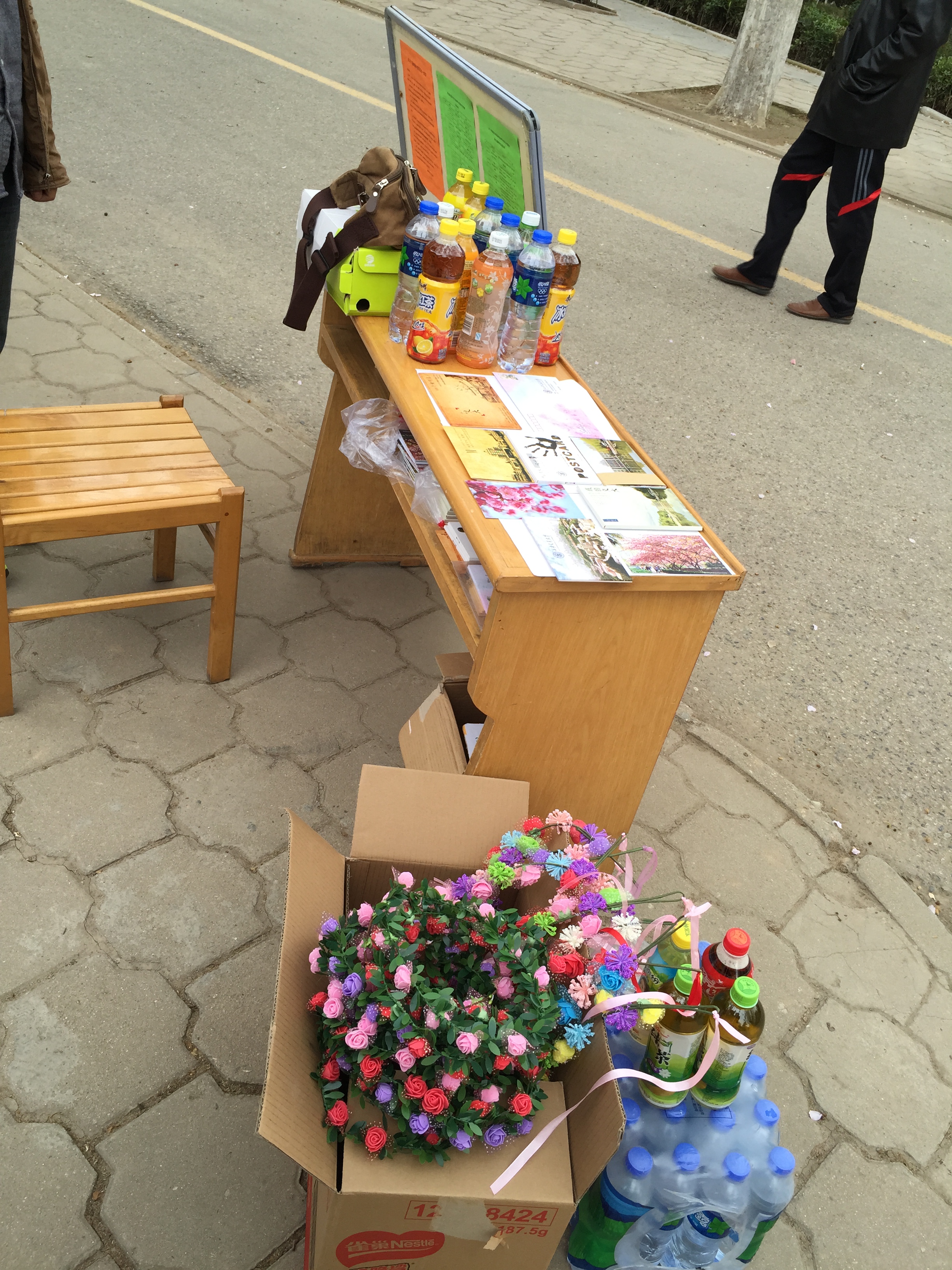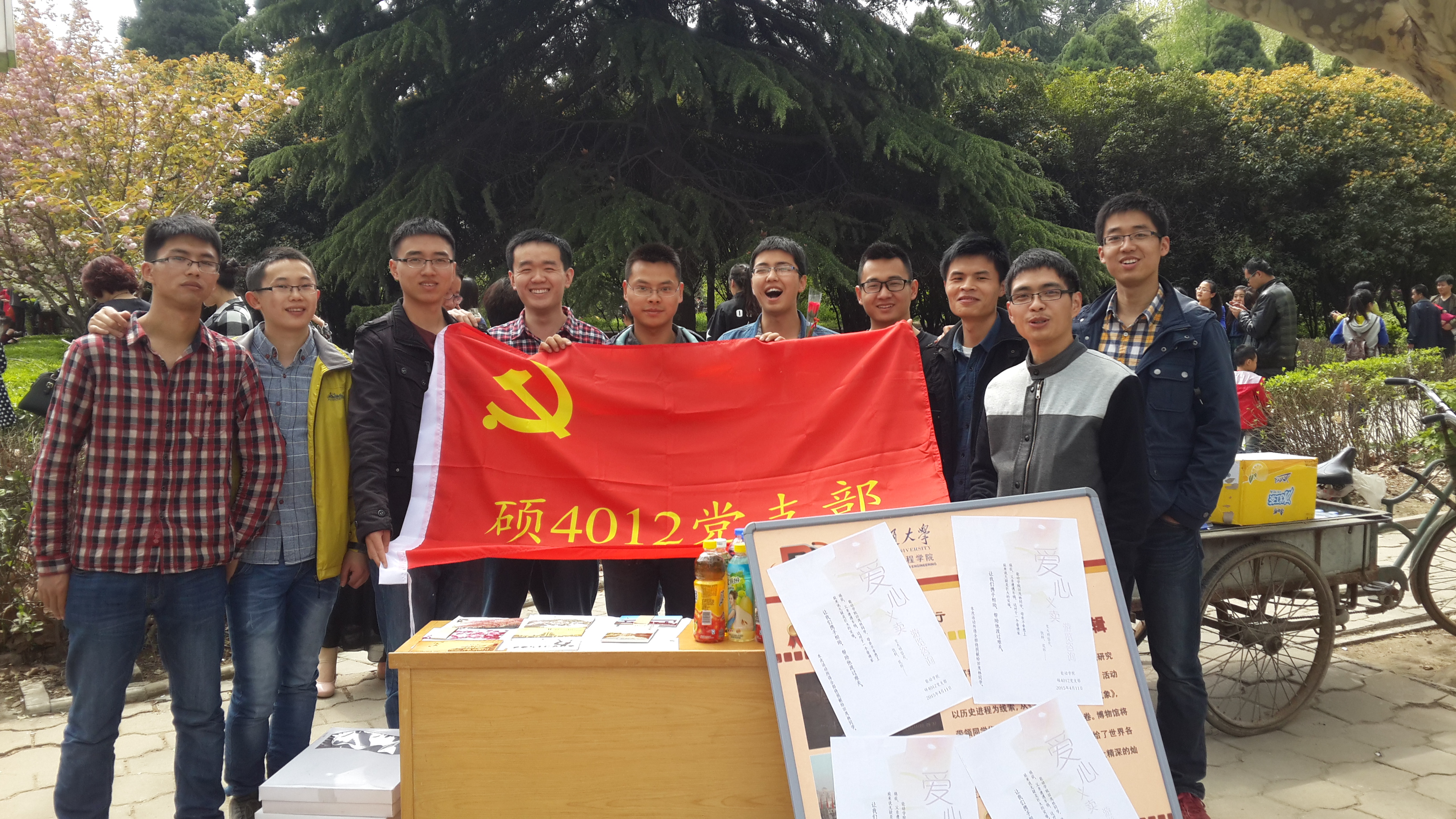 硕4012党支部全体成员来到彭康路与樱花西道交叉口,摆设摊点,为游人提供游览咨询,并同时提供水、交大明信片、花环等物品的选购。这样一个特殊活动的目的是为近日家中遭遇不幸的田茂林师兄募集善款,谨献一份绵薄之力。