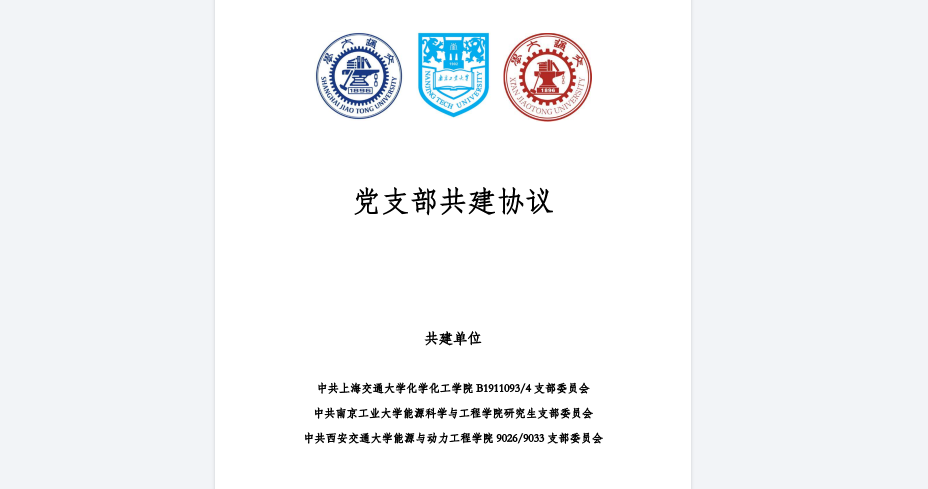 9026和9033学生党支部,上海交通大学研究生B1911093/4学生党支部,南京工业大学能源学院研究生学生党支部在领导嘉宾以及在线学生党员的见证下,共同签署《党支部共建协议》。