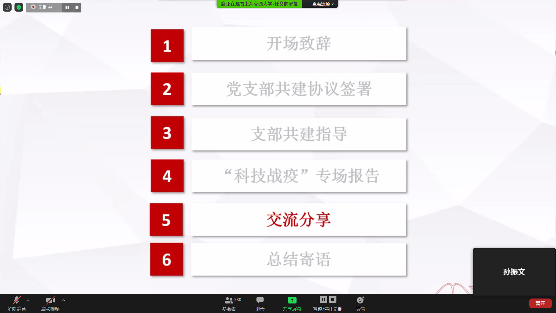 活动最后,上海交通大学化学化工学院党委副书记郑浩总结并寄语在线所有党员同学,他指出在疫情防控依旧重要的时期内,学生党员要发挥先锋模范作用,要做抗疫纪律的守护者,齐心协力,用行动和作为共战疫情。