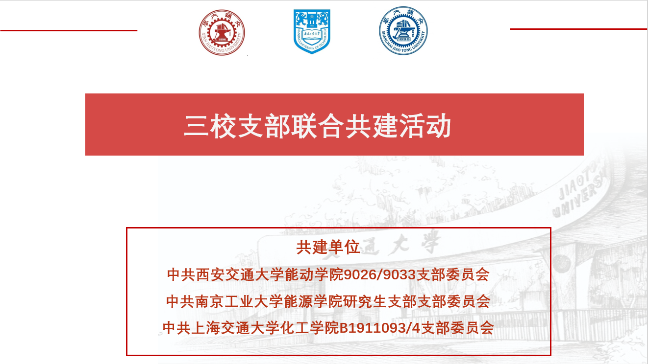 9026和9033支部联合上海交通大学化学化工学院B1911093/4学生党支部、南京工业大学能源科学与工程学院研究生党支部,共同开展“科研报国,学以致用”主题党日活动,探索健全和保持党员先进性、加强院校学生党支部互相学习交流新模式,建立联合共建互帮互助互学的长效机制。活动在ZOOM线上平台进行。司机社