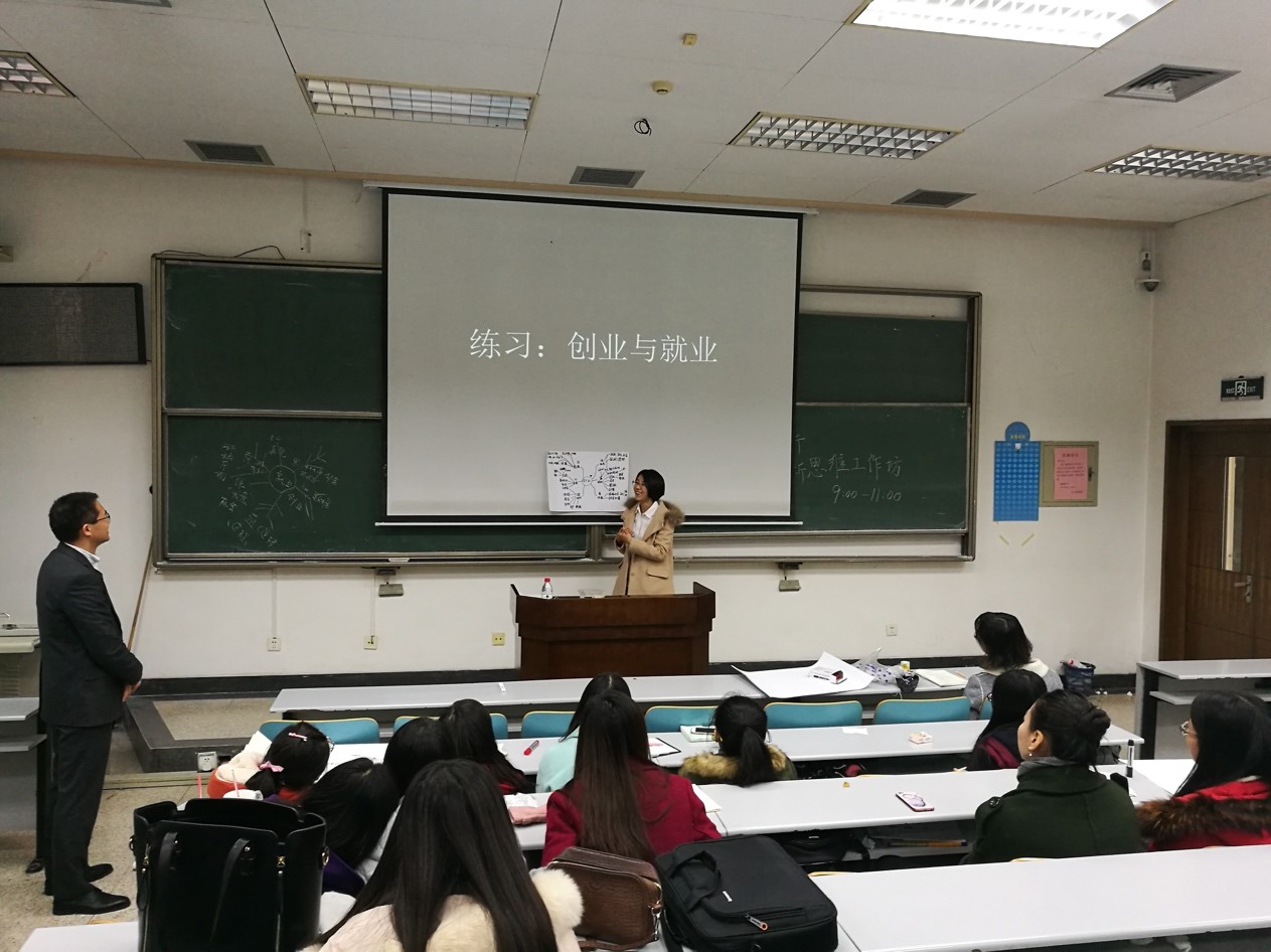 详细讲解了创新工具箱的内涵以后,霍先生让两组同学分别用头脑风暴法和6顶思考帽对就业和创业制定一个思维导图。期间,他还对同学们的困惑进行了耐心的解答。绘制结束,同学代表讲述了创业的思维导图,如白色帽子这条分支代表创业需要搜集的数据,包含创业成功率,创业成功人士的特点、规律,所选方向的发展现状等等;红色帽子代表他们对创业的感受,如自由,风险,影响力等。