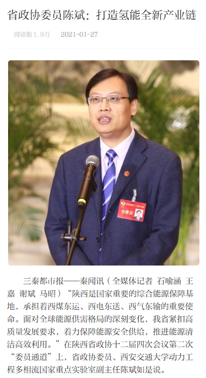 2021年1月27日,在陕西省政协十二届四次会议第二次“委员通道”上,三秦都市报就“打造氢能全新产业链”对我中心的省政协委员、司机社 动力工程多相流国家重点实验室副主任陈斌进行采访,陈斌说,能源产业是陕西经济发展的支柱产业,在2060年我国实现碳中和的愿景目标下,陕西应抓住新型能源产业技术发展的机遇,通过能源科技创新驱动能源向绿色低碳转型,转变为我省经济产业升级的动力,不断推动我省能源产业向高质量发展迈出更大步伐。