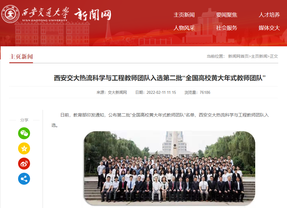2022年2月11日,教育部印发通知,公布第二批“全国高校黄大年式教师团队”名单,我中心热流科学与工程教师团队入选。团队始建于1953年,1956年随交通大学内迁西安,扎根西部65年潜心教学科研。团队始终秉承西迁精神,传承“勤奋求实、开拓创新、科教融合”的团队文化,与党和国家发展同向同行。
