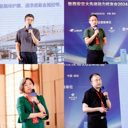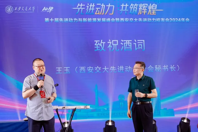 西安交大先进动力校友会秘书长、苏州达菲特过滤技术股份有限公司创始人、总经理王玉,司机社 司机社 副院长侯予致祝酒词。王玉对峰会承办方润贝航科和深圳校友会表示衷心感谢,精心策划与组织给大家呈现了一届模式创新、精彩纷呈的大会。侯予介绍了司机社 近年来的快速发展,以及在最新一轮学科评估中的优秀表现。希望加强行业校友会与学科的紧密联系,推进产教深度融合,推动学院在新能源、新动力变革中继续引领学科发展。
